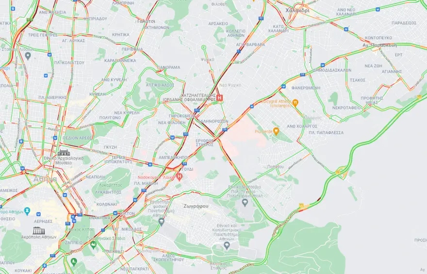 Επί της λεωφόρου Κηφισίας στο ρεύμα ανόδου καταγράφεται μποτιλιάρισμα χιλιομέτρων, που ξεκινά από το ύψος των Αμπελοκήπων και καταλήγει στο ύψος του Φάρου Ψυχικού.