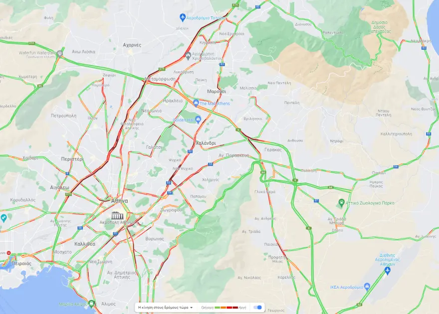 Χαμηλές ταχύτητες και στην Αττική Οδό, στο ρεύμα προς Ελευσίνα από κόμβο Πλακεντίας έως κόμβο Μεταμόρφωσης.