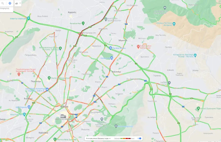 Αυξημένη είναι η κίνηση που καταγράφεται αυτή την ώρα στην εθνική οδό Αθηνών – Λαμίας, στο ρεύμα προς Πειραιά, στο ύψος της Μεταμόρφωσης, έπειτα από άλλο ένα πολύ δύσκολο πρωινό στους δρόμους, καθώς ο Κηφισός ήταν απροσπέλαστος και στα δύο ρεύματα για τουλάχιστον δύο ώρες.