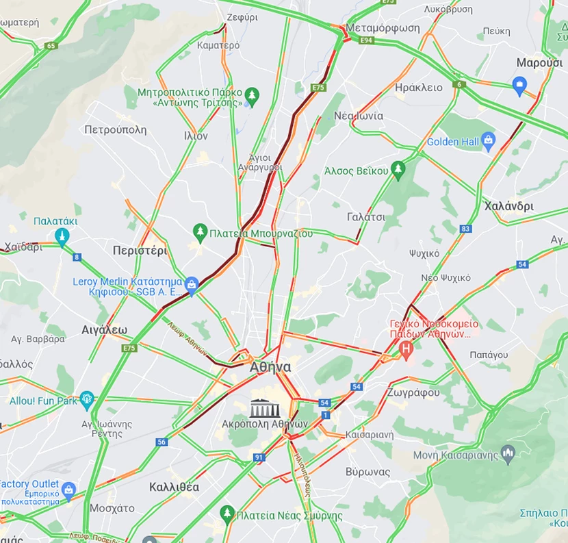 Σημειώνεται πως από νωρίς σήμερα πολλοί δρόμοι είναι στο «κόκκινο» εξαιτίας της απεργίας σε μετρό, ηλεκτρικό και τραμ.
