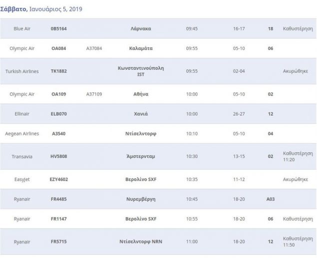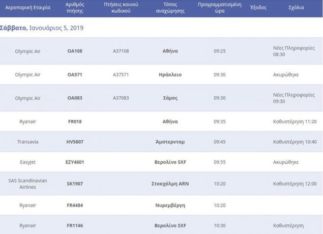 Μόνο την τελευταία ώρα έχουν ακυρωθεί οι αφίξεις της Ολυμπιακής (OA571) από Ηράκλειο και της EasyJet από το Βερολίνο (EZY4601), ενώ καταγράφονται καθυστερήσεις της τάξης των δυο ωρών σε πτήσεις της Ryanair (FR018) από Αθήνα, της SAS (SKI907) από Στοκχόλμη και της Transavia (HV5807) από Αμστερνταμ.