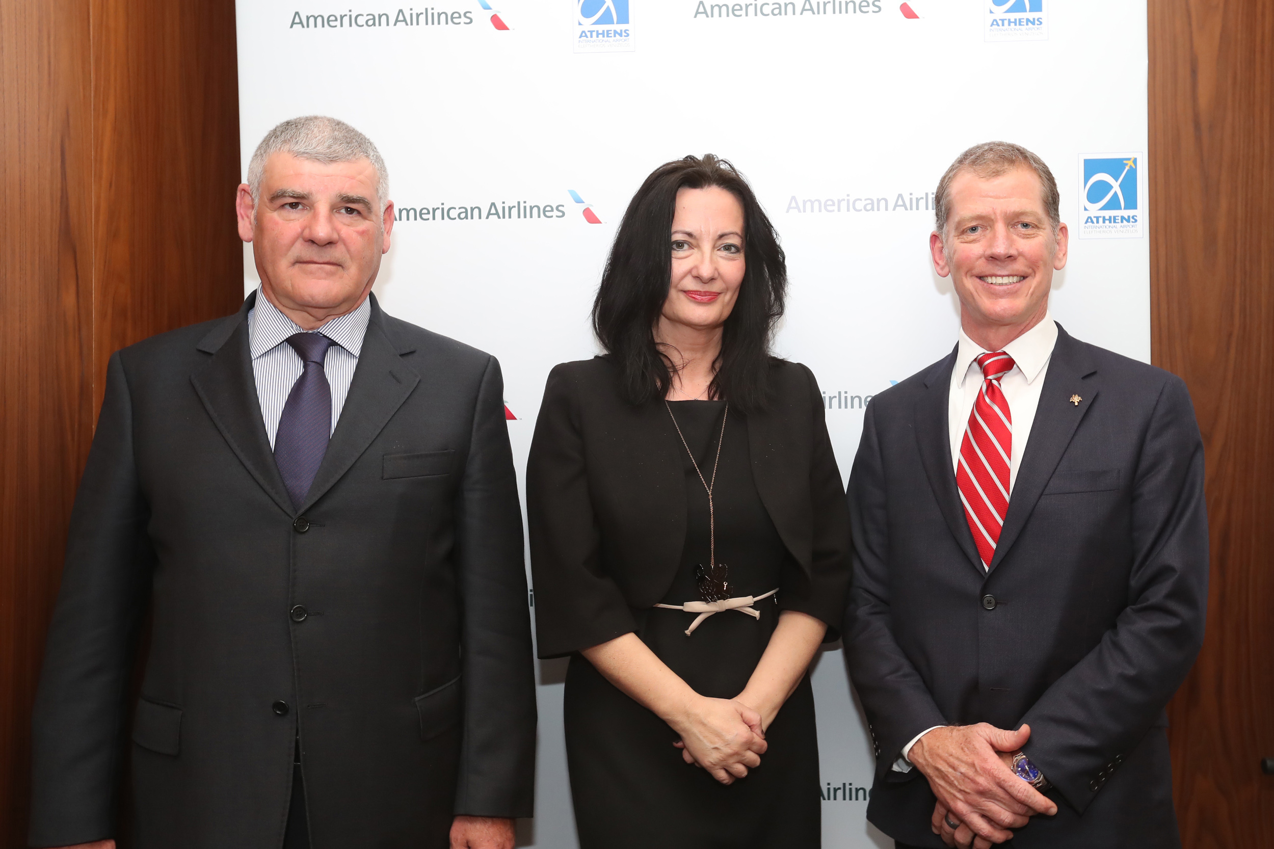 (Από αριστέρα ο κ. Angelo Camilletti, Manager, Sales Southest Europe, American Airlines, η κ. Ιωάννα Παπαδοπούλου, Διευθύντρια Επικοινωνίας & Μάρκετινγκ, Διεθνής Αερολιμένας Αθηνών και ο κ. Tom Lattig, Managing Director, EMEA Sales)