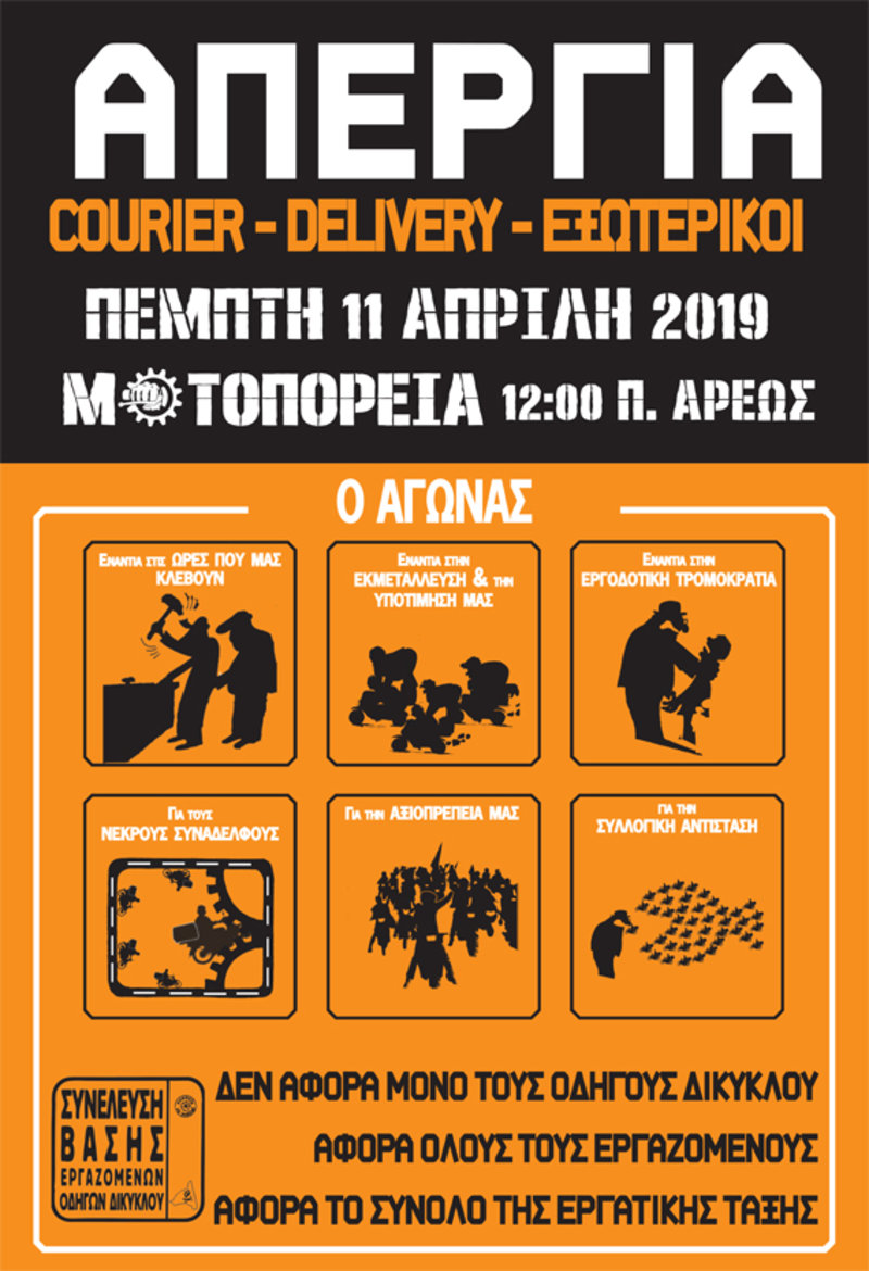 Οι εργαζόμενοι του κλάδου των διανομέων, ντελίβερι και κούριερ από την Αθήνα δίνουν ραντεβού στις 12:00 το μεσημέρι στο Πεδίον του Αρεως. Από εκεί θα πραγματοποιηθεί μοτοπορεία.