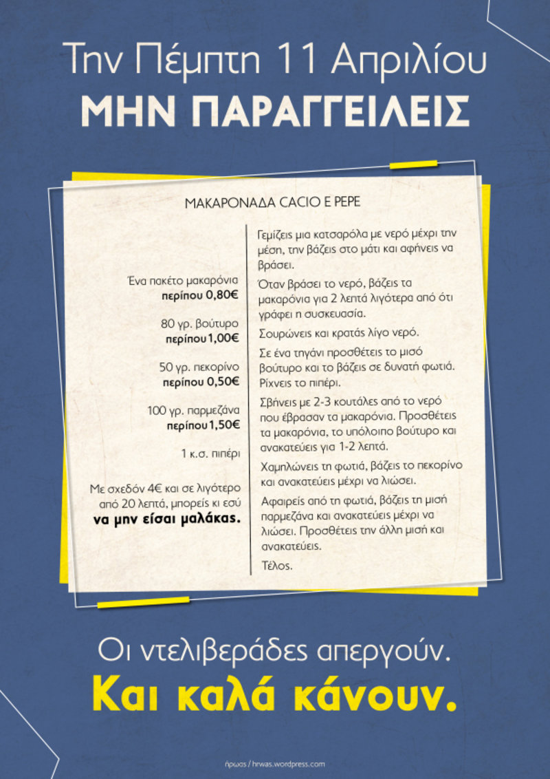 Σε μια ευφάνταστη αφίσα που διακινούν στα μέσα κοινωνικής δικτύωσης, οι ντελιβεράδες – κούριερ, προτείνουν, μάλιστα, μια οικονομική συνταγή για να ικανοποιήσουν την… πείνα, όσων ετοιμάζονταν να παραγγείλουν φαγητό.
