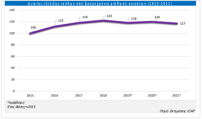 Σύμφωνα με πρόβλεψη της ICAP, βασισμένη σε κατάλληλο οικονομετρικό υπόδειγμα, τα έσοδα από βραχυχρόνια μίσθωση θα παρουσιάσουν μικρές ετήσιες μεταβολές την τριετία 2019-2021. Καθοριστικό ρόλο αναμένεται να διαδραματίσει η υποχρεωτική δήλωση/εγγραφή ακινήτων και η φορολόγηση των εισοδημάτων που προκύπτουν από την εξεταζόμενη δραστηριότητα, οι οποίες ενδέχεται να ανακόψουν μέρος της δυναμικής της.