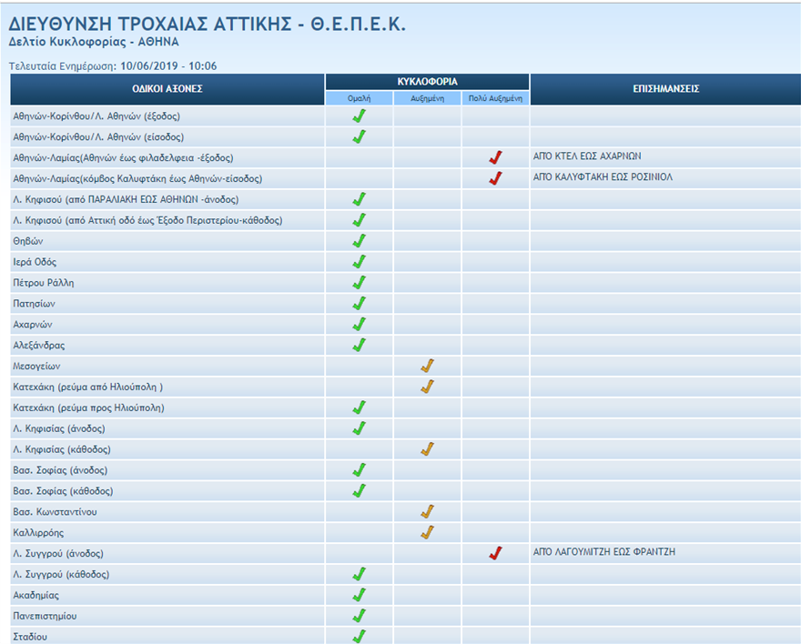 Σύμφωνα με την επίσημη ενημέρωση από την Τροχαία μποτιλιάρισμα παρατηρείται στα εξής σημεία: Αθηνών – Λαμίας (Αθηνών έως Φιλαδέλφεια – έξοδος) από ΚΤΕΛ έως Αχαρνών, Αθηνών – Λαμίας (κόμβος Καλυφτάκη έως Αθηνών – είσοδος) από Γέφυρα Τατοΐου έως ΚΤΕΛ, Αλεξάνδρας, Λ. Κηφισίας (κάθοδος) από κόμβο Παραδείσου έως Εθνικής Αντιστάσεως, Βασ. Κωνσταντίνου, Λ. Συγγρού (άνοδος) από Άγιος Σώστη έως Φραντζή, Λ. Ποσειδώνος (Αλίμου έως Καραϊσκάκη – ρεύμα προς Πειραιά).