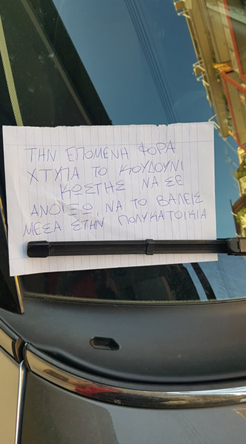 Συγκεκριμένα, στη φωτογραφία που έστειλε αναγνώστης στο thestival.gr, φαίνεται στο σημείωμα που άφησαν στον καθρέφτη του αυτοκινήτου, να γράφει: «Την επόμενη φορά χτύπα το κουδούνι «Κωστής», να σε ανοίξω να το βάλεις μέσα στην πολυκατοικία».