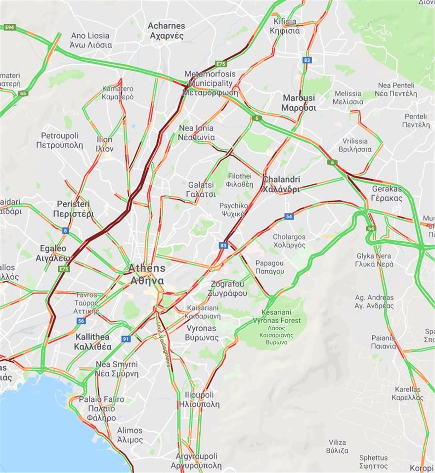 Πολύ δύσκολη η Κηφισίας και στα δύο ρεύματα από τον κόμβο των Αμπελοκήπων μέχρι το Μαρούσι.