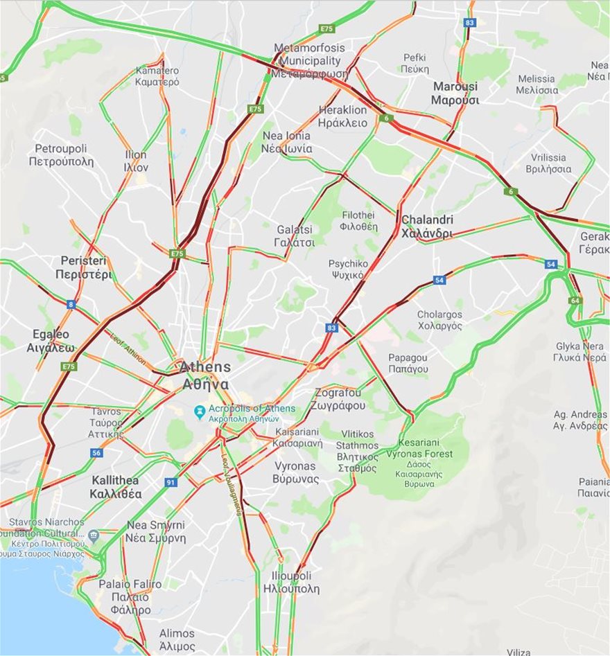 Τα οχήματα κινούνται με πολύ αργούς ρυθμούς στην άνοδο από το ύψος της Πειραιώς μέχρι τη Νέα Ιωνία και στην κάθοδο από τη Μεταμόρφωση μέχρι την Πειραιως.
