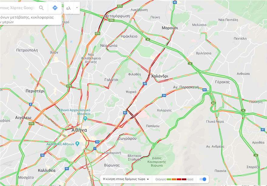 Τα σημαντικότερα προβλήματα αυτήν την ώρα καταγράφονται στη Λεωφόρο Κηφισίας τμηματικά και στα δύο ρεύματα, στην Εθνική Οδό Αθηνών – Λαμίας, στο ρεύμα προς Πειραιά, στο ύψος της Μεταμόρφωσης.