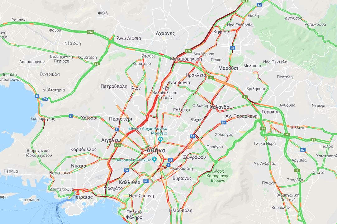 Στο κόκκινο βρίσκεται η κίνηση σε πολλούς δρόμους της Αττικής, με τους οδηγούς να βρίσκονται εγκλωβισμένοι σε ουρές χιλιομέτρων.