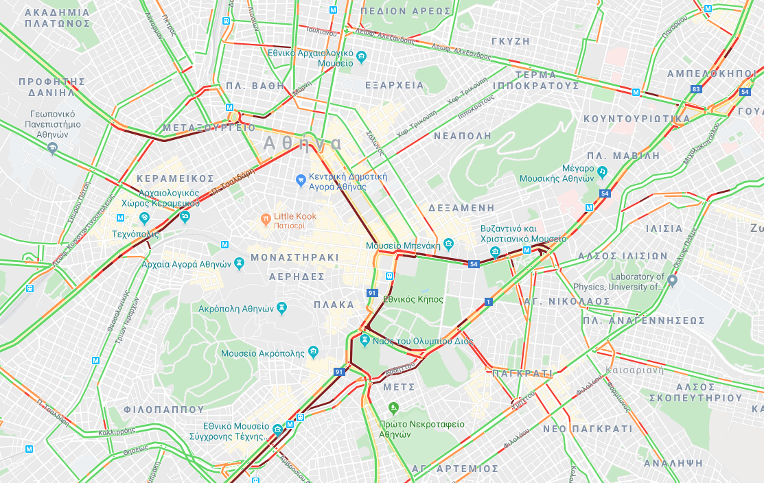 Αυτή την ώρα η εικόνα από τους δρόμους της Αθήνας είναι καλύτερη, ωστόσο ακόμα υπάρχει αυξημένη κίνηση στη λεωφόρο Κηφισίας, τη βασιλίσσης Σοφίας, την Αλεξάνδρας και τους δρόμους γύρω από το κέντρο.