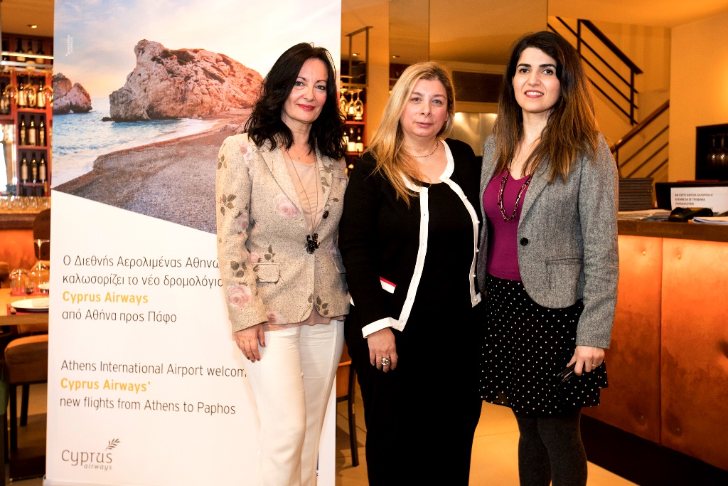 Από αριστερά, η κ. Ιωάννα Παπαδοπούλου, Διευθύντρια Επικοινωνίας & Μάρκετινγκ, Διεθνής Αερολιμένας Αθηνών, η κ. Κική Χάιδα, PR & Marketing Manager, Cyprus Airways και η κ. Ιωάννα Χατζηκωστή, Εκπρόσωπος του Υφυπουργείου Τουρισμού Κύπρου στην Αθήνα