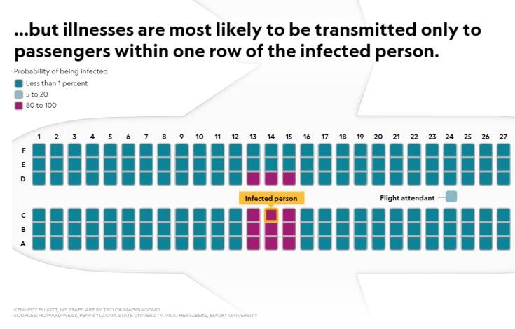 Ο καθηγητής βιολογίας και μαθηματικών του Penn State Univerity, Howard Weiss, αναφέρει: «Ας υποθέσουμε ότι κάθεστε σε καθίσματα διαδρόμου ή σε μεσαία καθίσματα και περπατάω για να πάω στην τουαλέτα. Θα είμαστε σε στενή επαφή, δηλαδή θα είμαστε σε απόσταση ενός μέτρου. Έτσι, αν μολυνθώ, θα μπορούσα να σας μεταδώσω τον ιό».