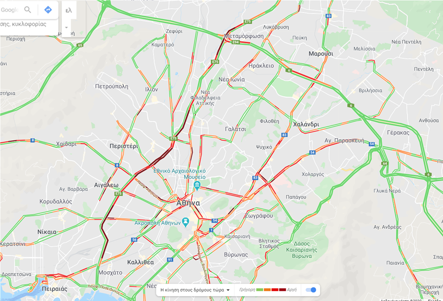 Σύμφωνα με τον χάρτη κυκλοφορίας της Google αυτή την ώρα, επικρατεί μεγάλο μποτιλιάρισμα στο ρεύμα ανόδου της Εθνικής Οδού Αθηνών – Λαμίας, από το ύψος χαμηλά στο Μοχάτο μέχρι και τη Νέα Φιλαδέλφεια. Μποτιλιάρισμα θα συναντήσουν οι οδηγοί και στο καθοδικό ρεύμα της Εθνικής Οδού Αθηνών – Λαμίας στο ρεύμα προς Πειραιά, στο ύψος της Μεταμόρφωσης, όπως και στον Κηφισό, τμηματικά.