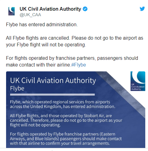 Ο αντίκτυπος του κορωνοϊού στις κρατήσεις πτήσεων υπήρξε καταλυτικός παράγοντας, για την αεροπορική εταιρεία που εδρεύει στην Exeter, η οποία εκμεταλλεύεται σχεδόν το 40% των εσωτερικών πτήσεων του Ηνωμένου Βασιλείου, καθώς η κυβέρνηση σταμάτησε σε ένα αμφιλεγόμενο δάνειο 100 εκατομμυρίων λιρών.