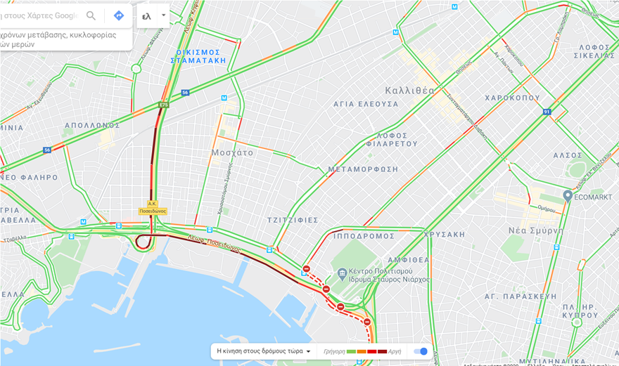Σύμφωνα με επίσημη ενημέρωση από την Τροχαία, η κίνηση καταγράφεται από το ύψος του Κηφισού μέχρι και το Δέλτα Φαλήρου.