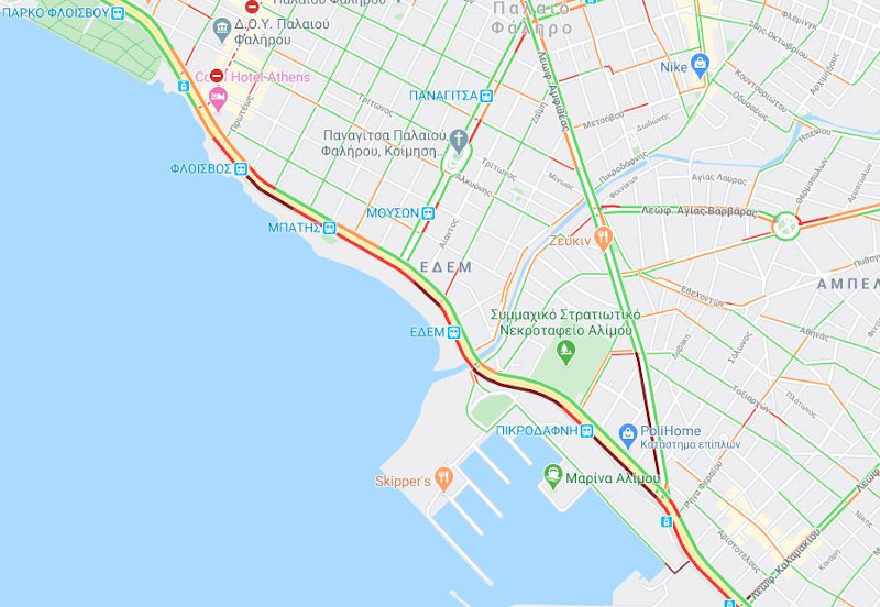 Ο παρακάτω «κοκκινισμένος» χάρτης σε αρκετά σημεία της παραλιακής είναι χαρακτηριστικός της κατάστασης που επικράτησε το πρωί στην παραλιακή.