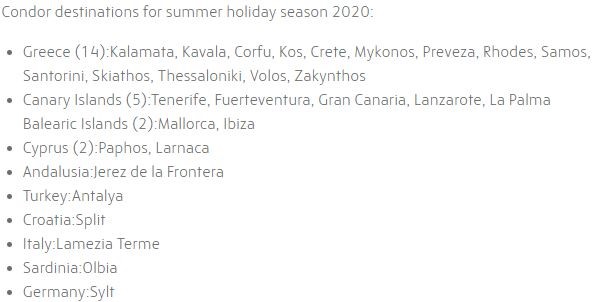 Όπως προκύπτει, οι 14 προορισμοί της λίστας των πτήσεων είναι προς την Ελλάδα! Η Condor θα «πετά» το καλοκαίρι -έως και τον Οκτώβριο- προς Καλαμάτα, Καβάλα, Κέρκυρα, Κω, Κρήτη, Μύκονο, Πρέβεζα, Ρόδο, Σάμο, Σαντορίνη, Σκιάθος, Θεσσαλονίκη, Βόλο και Ζάκυνθο.