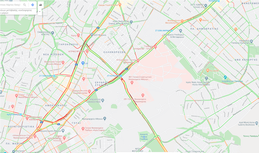 Στο «κόκκινο» οι δρόμοι της Αθήνας αυτή την ώρα.