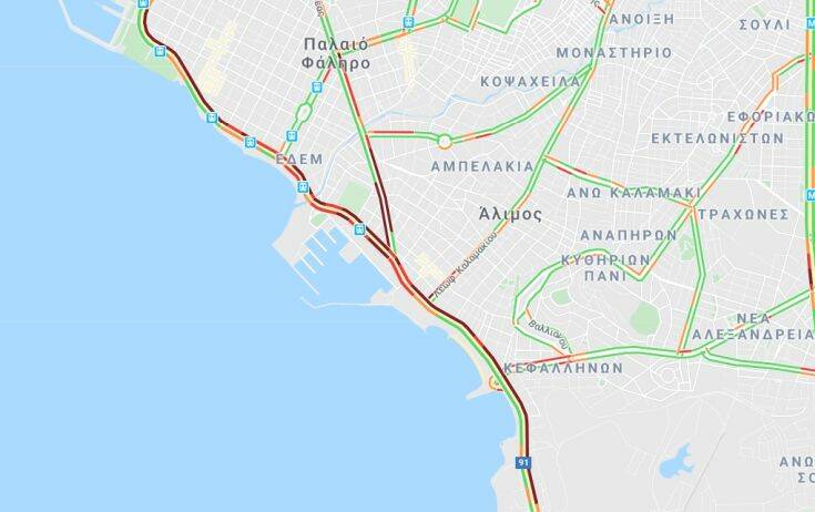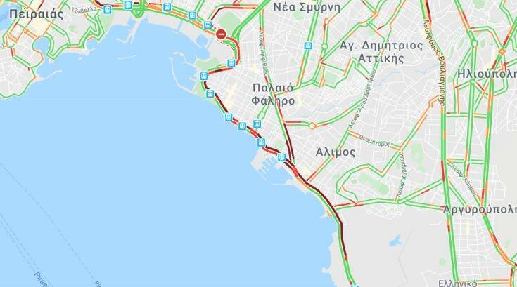 Μία λωρίδα κυκλοφορίας είναι κλειστή λόγω έργων, με αποτέλεσμα το μποτιλιάρισμα να αρχίζει περίπου από το ύψος του παλαιού αεροδρομίου, στη Γλυφάδα, ενώ ντόμινο προβλημάτων προκαλείται και στη Λεωφόρο Συγγρού.