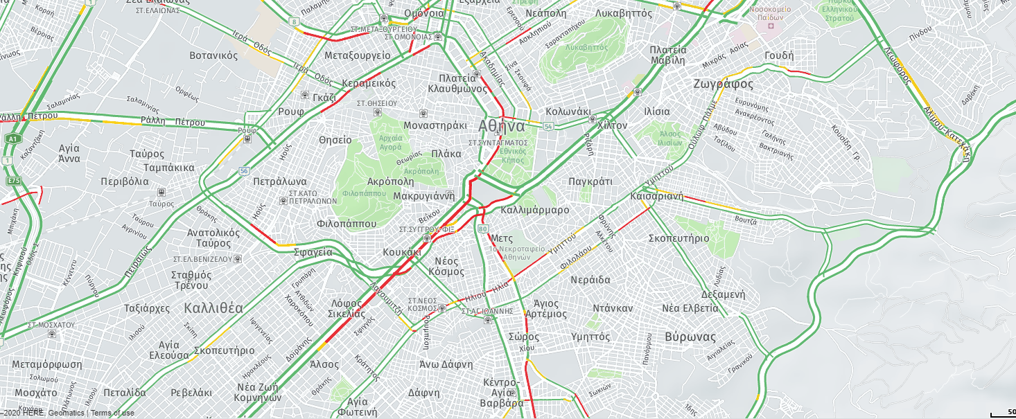 Έντονο κυκλοφοριακό στην κάθοδο της Μεσογείων μέχρι την Αγία Παρασκευή και στην κάθοδο της Κηφισίας από Κατεχάκη μέχρι Αλεξάνδρας.