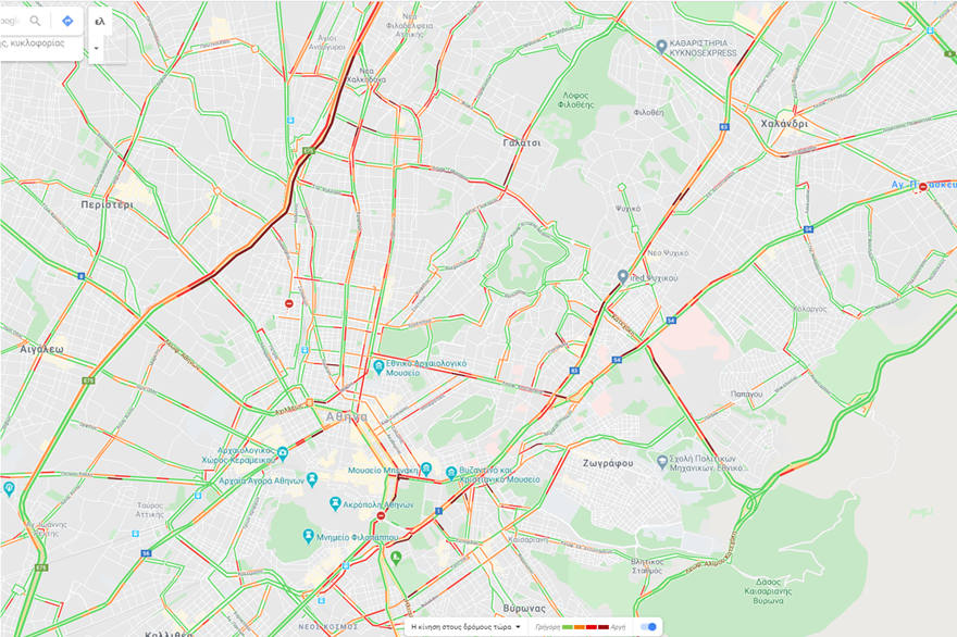 Κίνηση υπάρχει στο ανοδικό ρεύμα επί της Βασιλέως Κωνσταντίνου, ενώ στο κόκκινο βρίσκεται και η λεωφόρος Βασιλίσσης Αμαλίας.