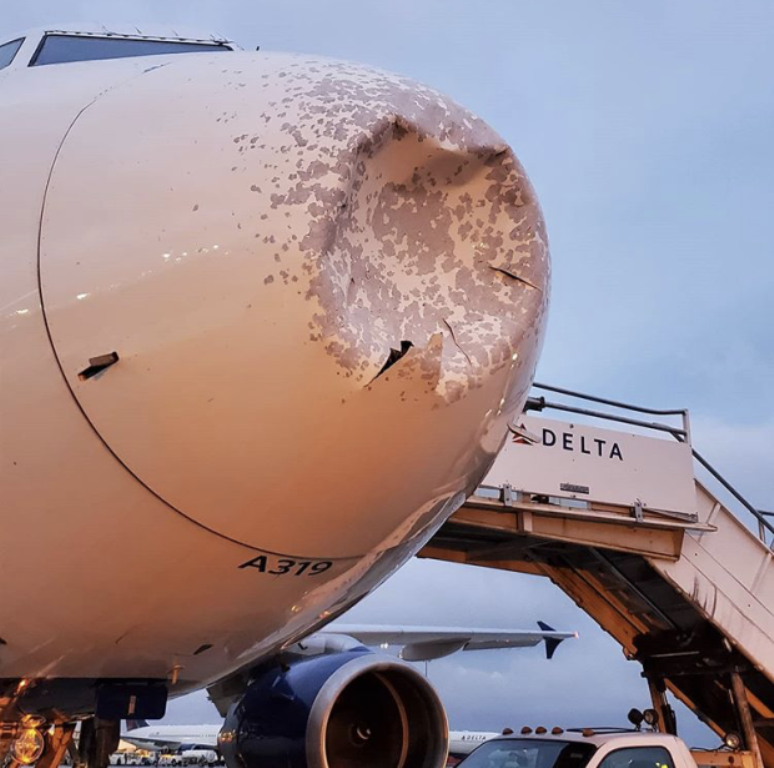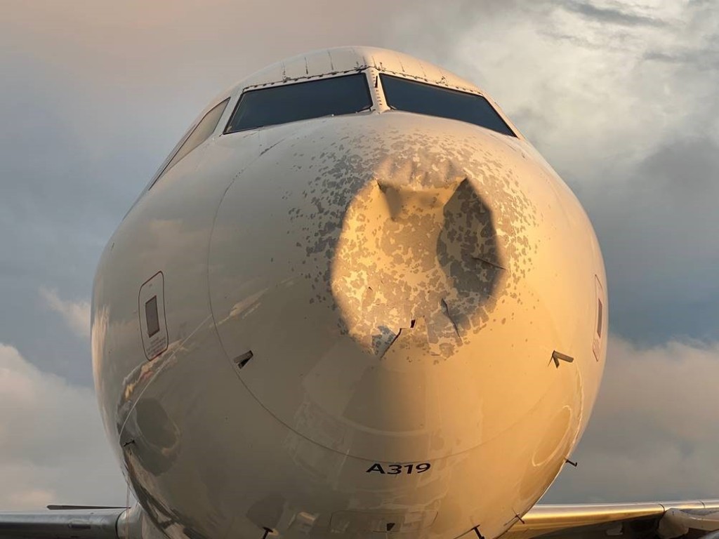 Ωστόσο, λίγο αργότερα η αμερικανική αεροπορική εταιρία άλλαξε την αιτία της ζημιάς που προκλήθηκε κι έκανε λόγο για χαλάζι, που όχι απλώς παραμόρφωσε τη «μύτη», αλλά προκάλεσε και μικρό μηχανικό πρόβλημα στον εξοπλισμό πλοήγησης.