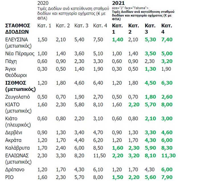 Οι τιμές αυτές υπολογίζονται βάσει του Δείκτη Τιμών Καταναλωτή του Σεπτεμβρίου 2020 και αφορούν σε όλους τους σταθμούς διοδίων και σε όλες τις κατηγορίες οχημάτων κατά περίπτωση, σύμφωνα με τον παρακάτω πίνακα.