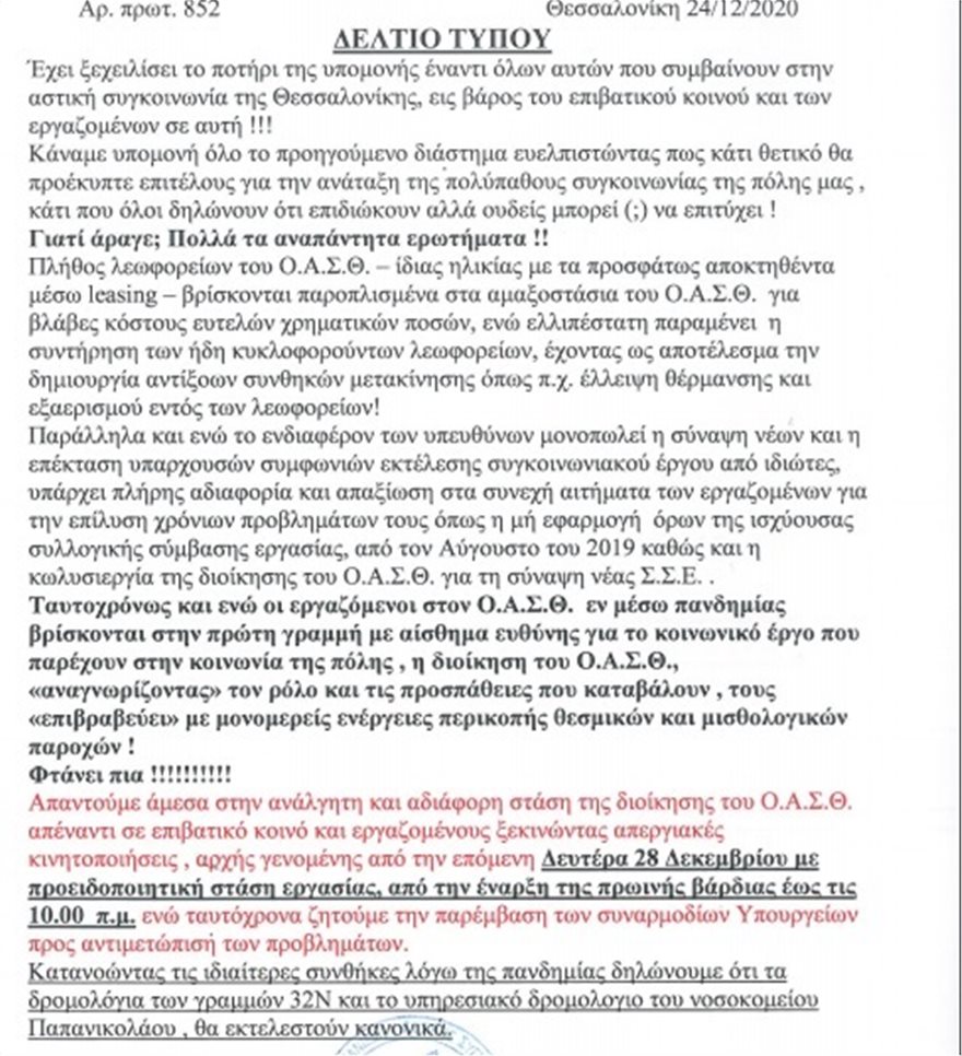 «Έχει ξεχειλίσει το ποτήρι της υπομονής έναντι όλων αυτών που συμβαίνουν στην αστική συγκοινωνία της Θεσσαλονίκης, εις βάρος του επιβατικού κοινού και των εργαζομένων σε αυτή», αναφέρουν οι εργαζόμενοι στον ΟΑΣΘ.