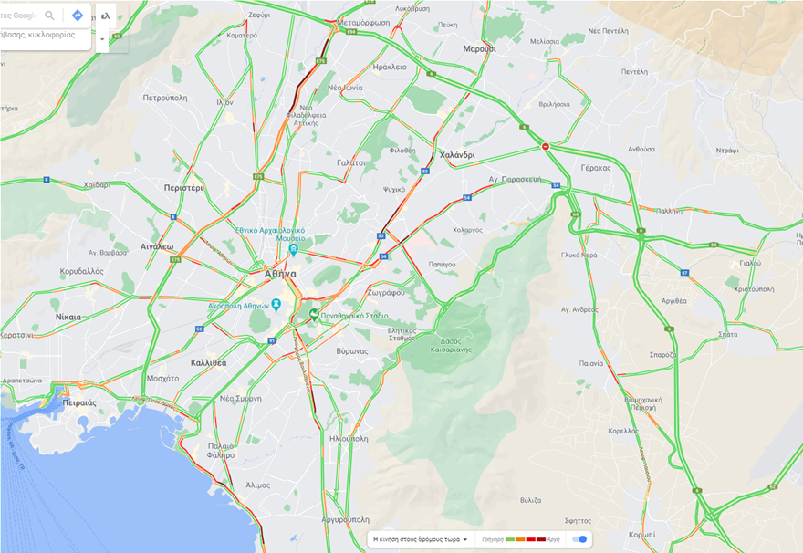 Μποτιλιαρισμένο και το ανοδικό ρεύμα της εθνικής οδού Αθηνών – Λαμίας, στο ρεύμα προς Πειραιά, στο ύψος της Νέας Φιλαδέλφειας.
