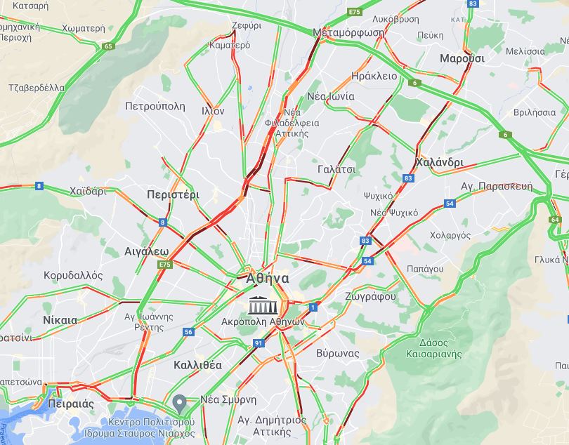 Όπως φαίνεται στον χάρτη, πολύ δύσκολη είναι η κατάσταση και στα δύο ρεύματα της λεωφόρου Κηφισού ενώ προβλήματα υπάρχουν και στους δρόμους του Πειραιά.