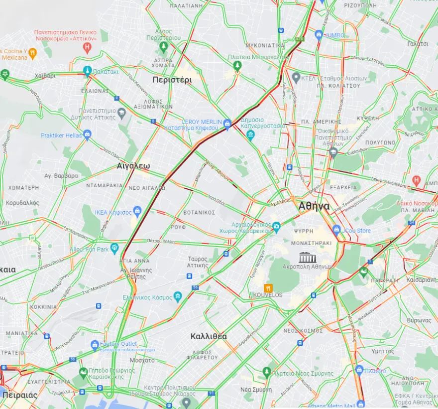 Στο «κόκκινο» είναι η κίνηση που καταγράφεται το μεσημέρι της Πέμπτης 2 Ιουνίου σε αρκετές λεωφόρους της Αττικής με αποκορύφωμα τον Κηφισό.