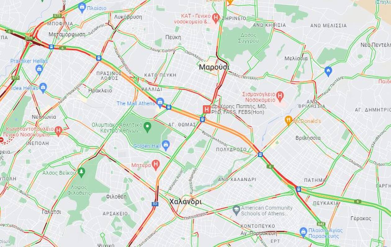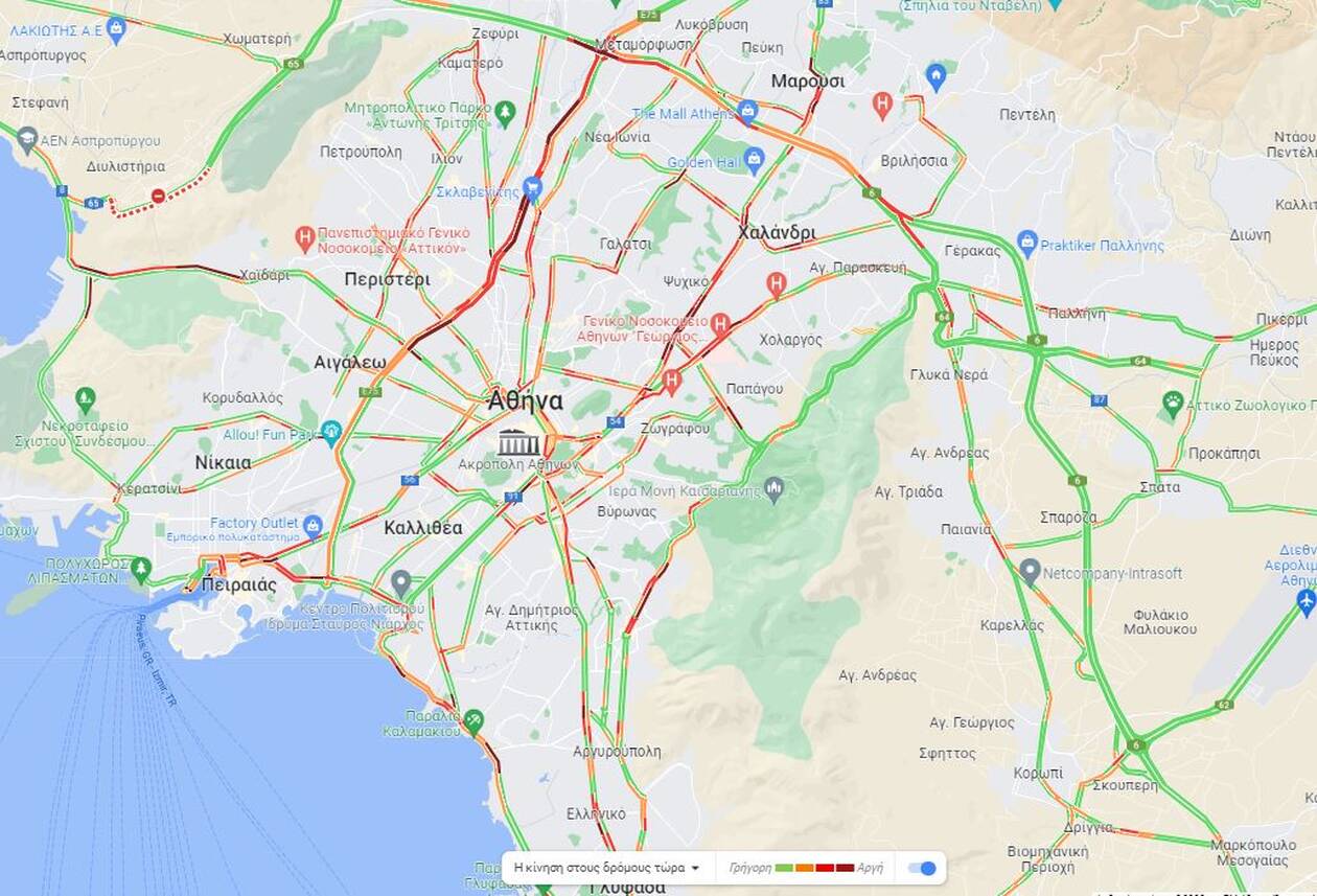 Αυξημένη κίνηση και στην κάθοδο της Μεσογείων, στο ρεύμα της Κηφισίας προς το κέντρο της Αθήνας αλλά και στους δρόμους του Πειραιά.