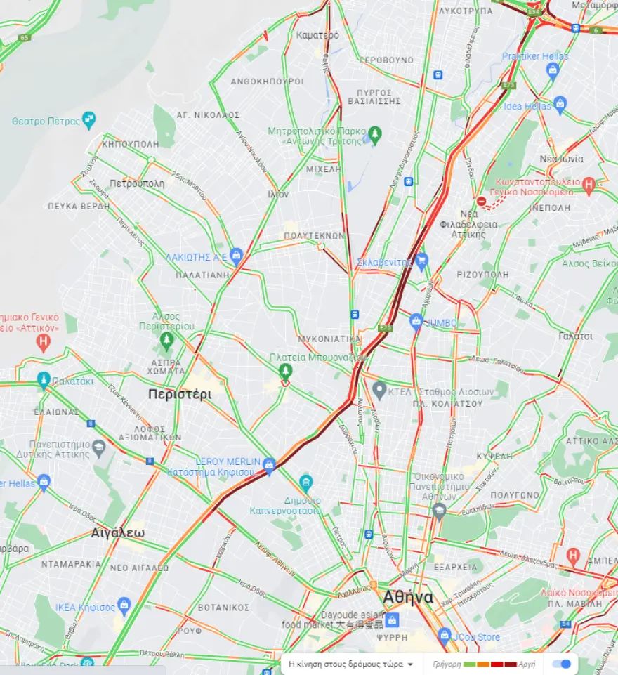 Πυκνή ροή των οχημάτων παρατηρείται επίσης σε άνοδο Συγγρού, Βασ. Κων/νου, Αλεξάνδρας, Κηφισίας (άνοδο), Μεσογείων (κάθοδο) και περιφερειακό Καρέα.