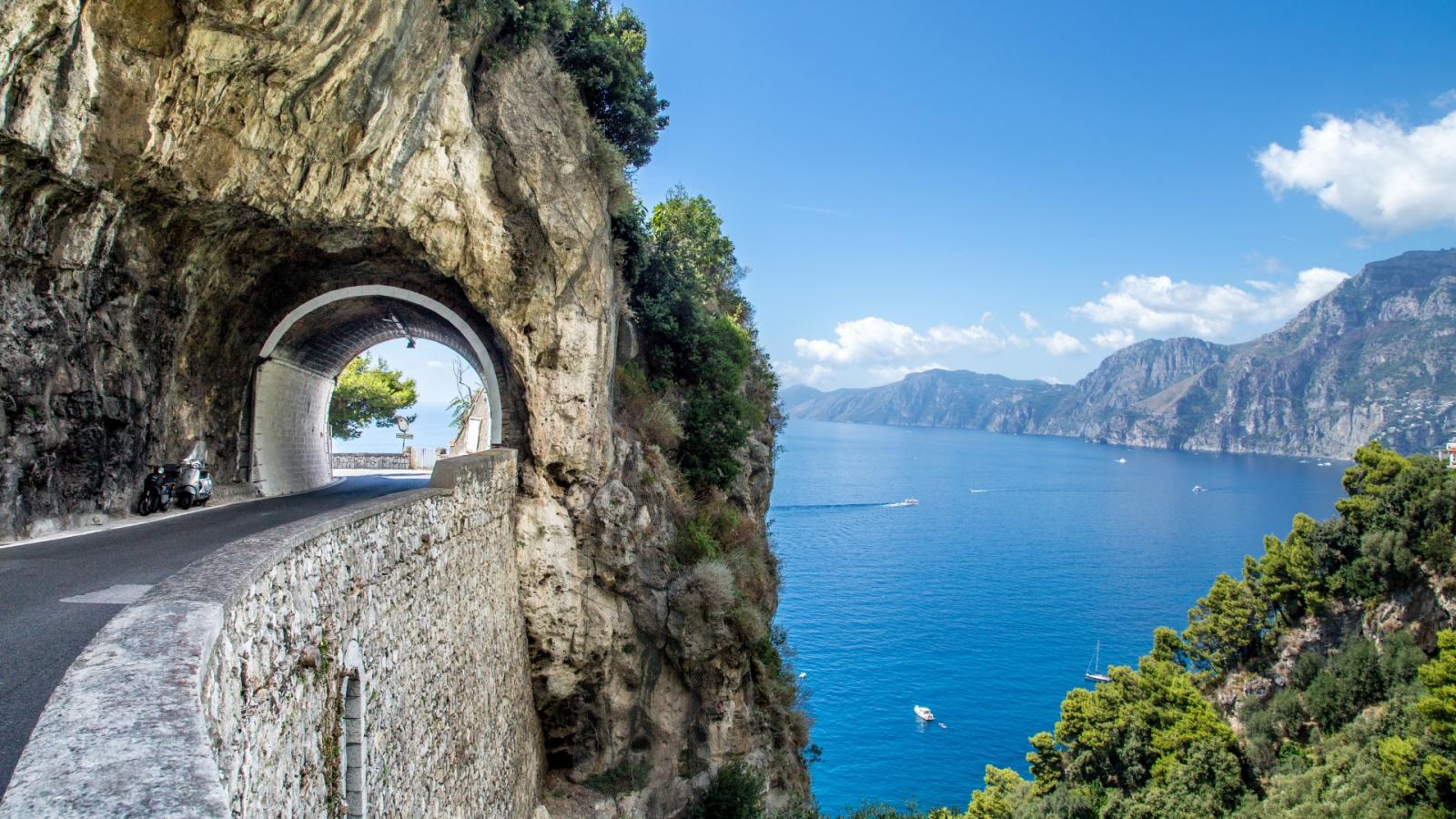 Διασχίζοντας με το αυτοκίνητό μας την Ακτή του Αμάλφι θα σαγηνευτούμε από το απαράμιλλης ομορφιάς τοπίο: Από τη μία μεριά ξεδιπλώνεται ο καταπράσινος λόφος με τα παστέλ χρώματος σπιτάκια και από την άλλη δεσπόζουν τα κρυστάλλινα νερά του Τυρρηνικού Πελάγους.