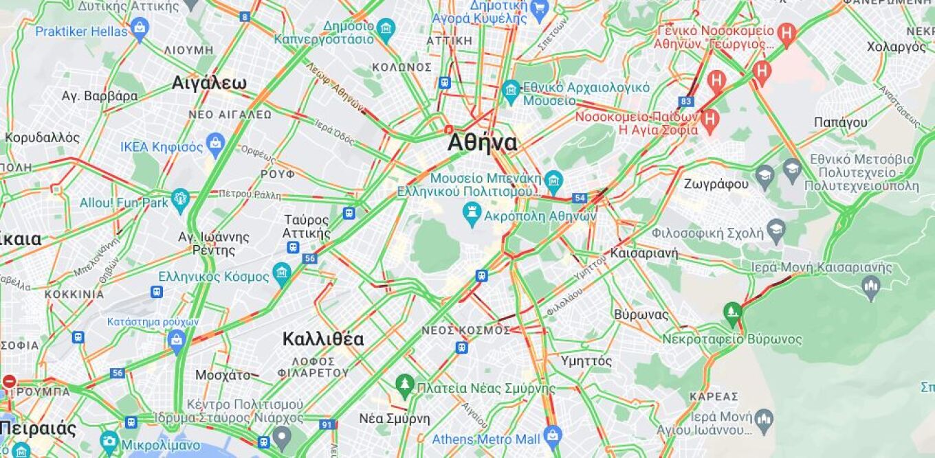 Αυξημένη ήταν η κίνηση και στα δύο ρεύματα της Κηφισίας, στη Μεσογείων, την Αλεξάνδρας, στη Βασιλίσσης Σοφίας, τη Συγγρού, την Ιερά Οδό και τον Πειραιά.