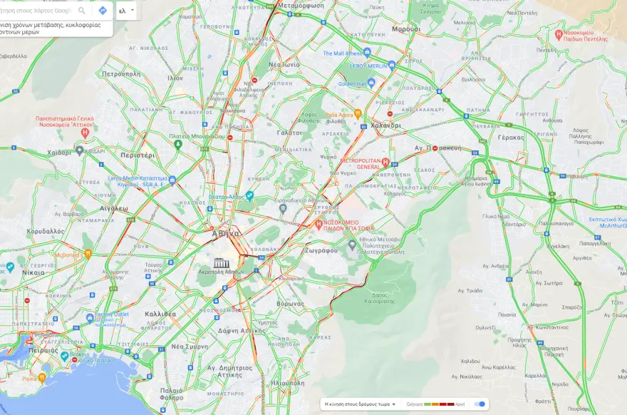 Έντονη κυκλοφοριακή συμφόρηση παρατηρείται, κυρίως, στο κέντρο της Αθήνας.