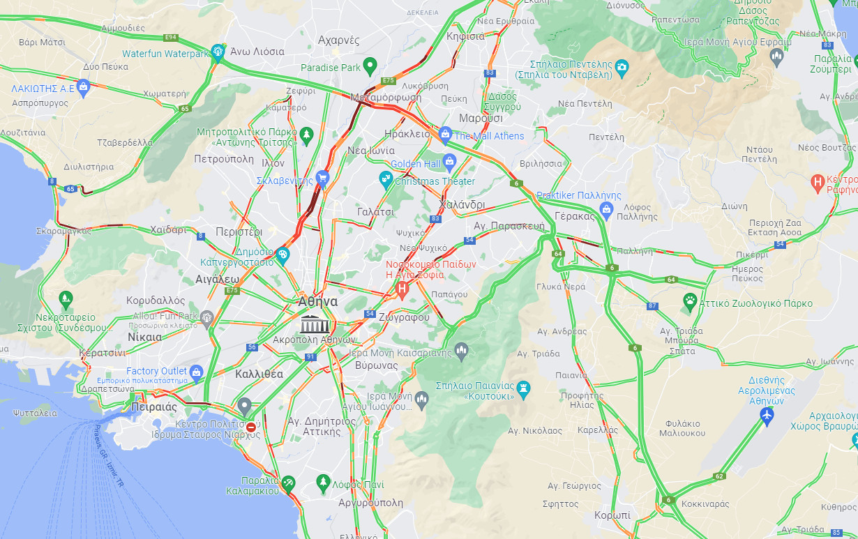 Σύμφωνα με την επίσημη ενημέρωση της Τροχαίας, αλλά και με μια απλή ματιά στον χάρτη, τα αυτοκίνητα στον Κηφισό είναι σχεδόν ακινητοποιημένα.