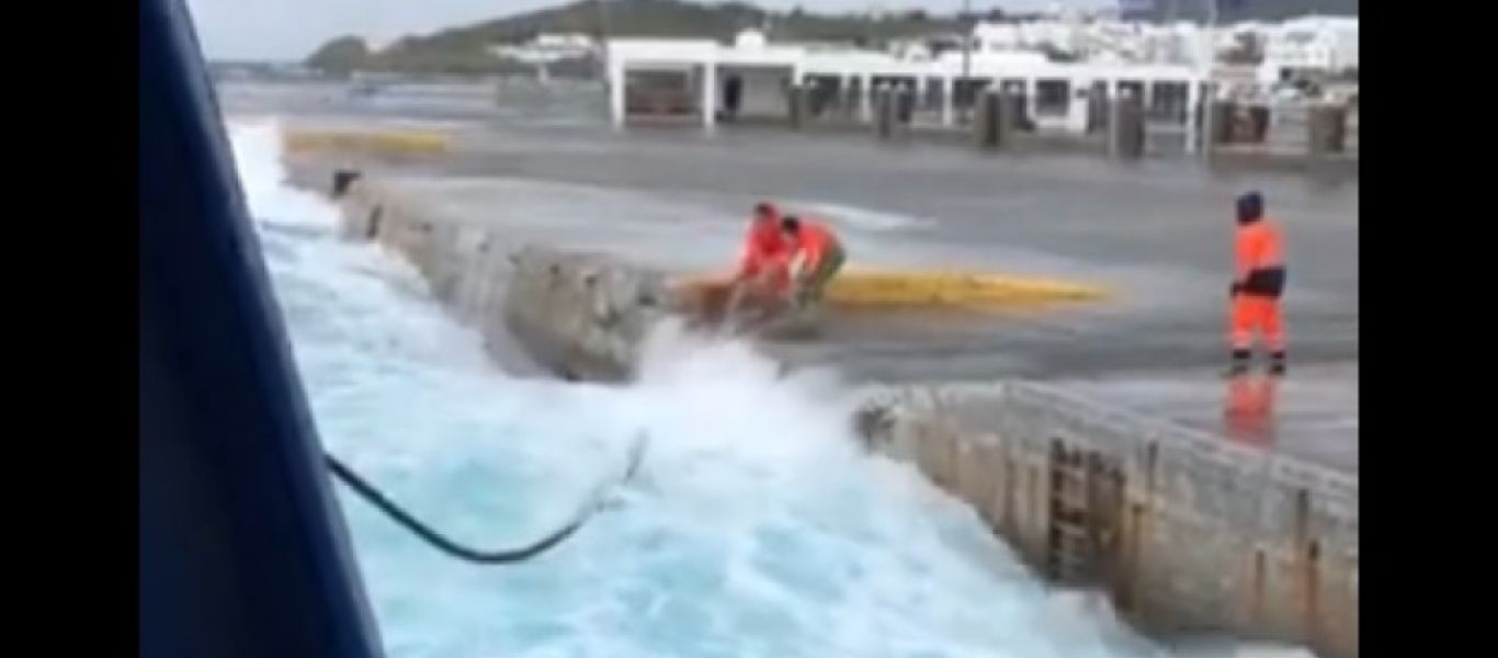Στο βίντεο που κυκλοφορεί, διακρίνονται δυο καβοδέτες να επιχειρούν να αποδεσμεύσουν το καραβόσκοινο, όταν ένα τεράστιο κύμα σκάει πάνω τους και τους «εξαφανίζει» από το πλάνο. Μάλιστα, ο ένας πέφτει κάτω, ωστόσο στέκεται τυχερός, καθώς παρασύρεται προς το εσωτερικό του λιμανιού και όχι προς τη θάλασσα.