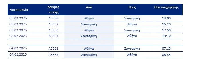 Σημειώνεται ότι και οι τέσσερις (4) τακτικές, προγραμματισμένες καθημερινές πτήσεις από και προς τη Σαντορίνη θα εκτελούνται κανονικά και σύμφωνα με τον αρχικό προγραμματισμό.