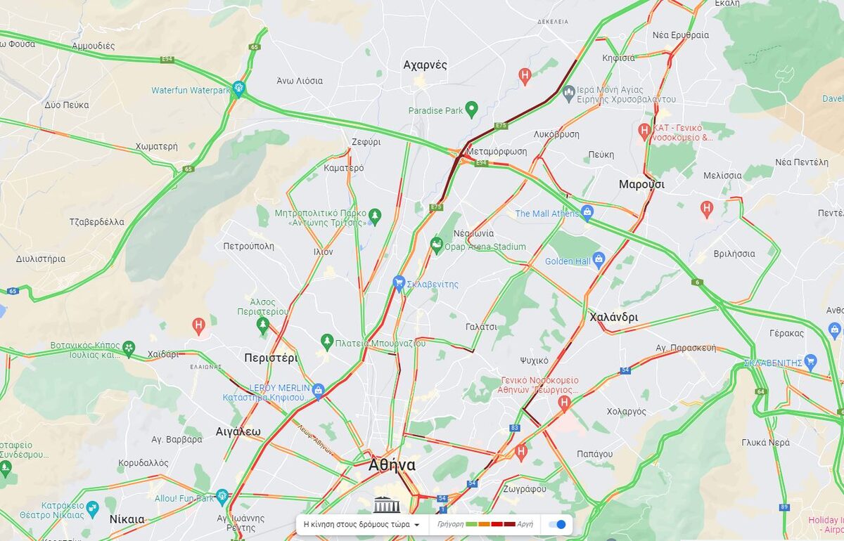 Επίσης, η Κηφισίας είναι στο «κόκκινο» στο μεγαλύτερο μέρος της και στα δύο ρεύματα. Η Μεσογείων είναι μποτιλιαρισμένη κυρίως στην Αγία Παρασκευή και κοντά στο κέντρο.