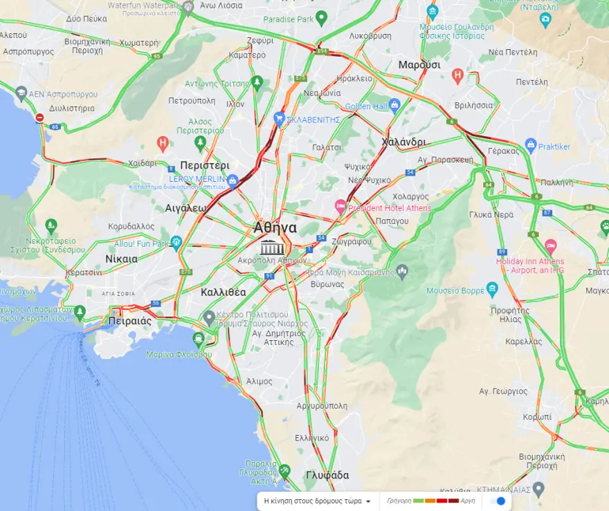 Συγκεκριμένα, μεγάλες καθυστερήσεις παρατηρούνται στη Λεωφόρο Κηφισού και στα δύο ρεύματα, από το ύψος του Περιστερίου έως και τη Νέα Φιλαδέλφεια, ενώ κυκλοφοριακή συμφόρηση επικρατεί στη λεωφόρο Κηφισίας καθώς και στην Κατεχάκη στο ύψος της Ελληνορώσων, σε τμήματα της λεωφόρου Ποσειδώνος, καθώς και στη λεωφόρο Συγγρού και την Καλλιρόης.