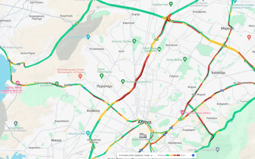 Μεγάλες καθυστερήσεις καταγράφονται στην άνοδο του Κηφισού από την Ιερά Οδό μέχρι τη Νέα Φιλαδέλφεια και στην κάθοδο από την Λυκόβρυση μέχρι τη Νέα Ιωνία.