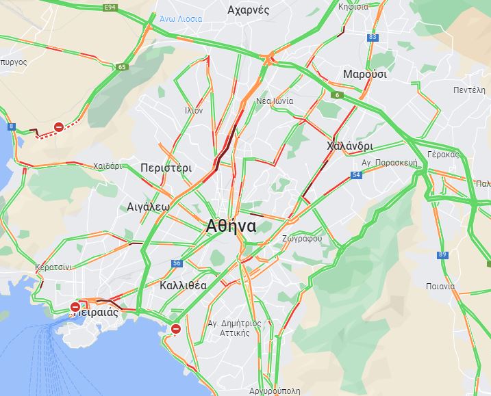 Συγκεκριμένα, μποτιλιάρισμα υπάρχει στην άνοδο και την κάθοδο του Κηφισού, στη λεωφόρο Κηφισίας, στη λεωφόρο Αθηνών, αλλά και στους δρόμους γύρω από το κέντρο της Αθήνας και του Πειραιά.