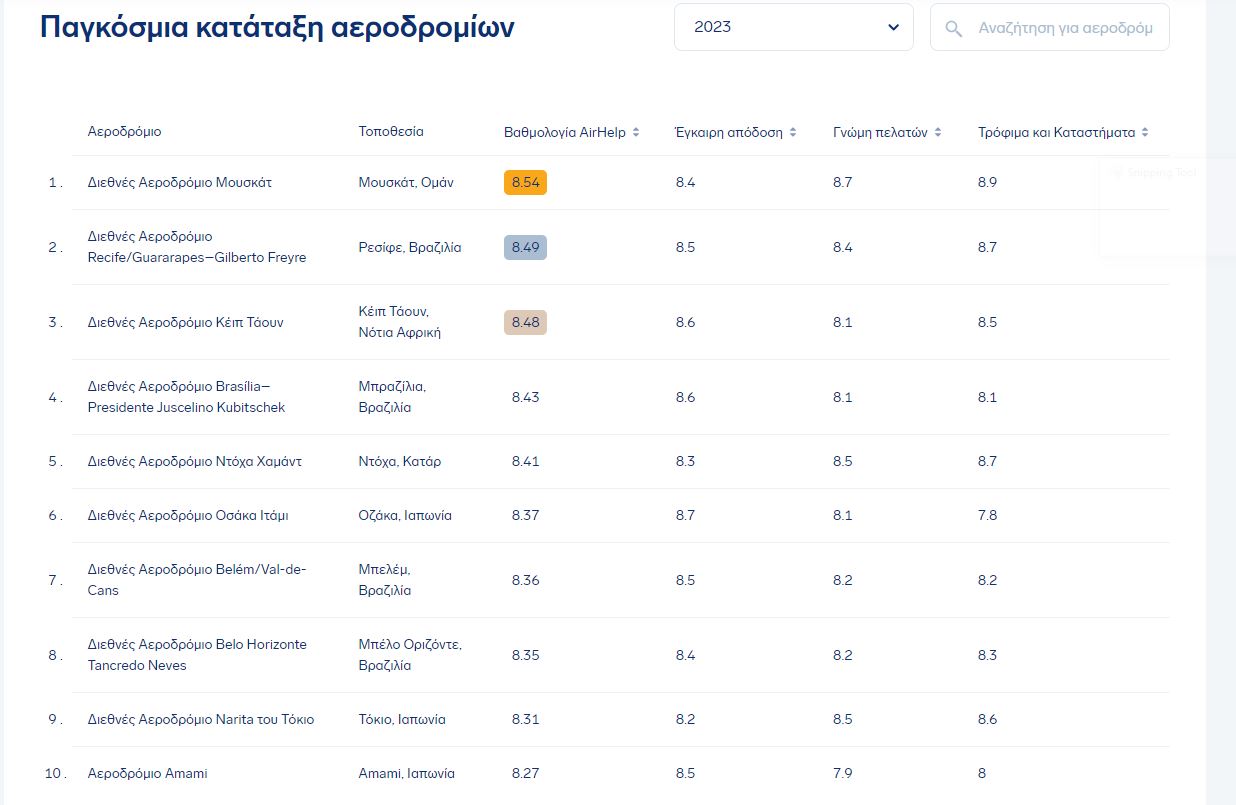 Εξετάζοντας την παγκόσμια κατάταξη αποκαλύπτεται ότι το Διεθνές Αεροδρόμιο Μουσκάτ στο Ομάν βρίσκεται στην πρώτη θέση ως το κορυφαίο αεροδρόμιο στον κόσμο, με 8,54 βαθμούς. Ενώ αυτό το αεροδρόμιο είναι μια νέα είσοδος για το 2023, σημείωσε κατά μέσο όρο 8,7 βαθμούς στις κατηγορίες της ακρίβειας, των απόψεων πελατών και των τροφίμων και καταστημάτων. Το διεθνές αεροδρόμιο Recife/Guararapes–Gilberto Freyre στη Βραζιλία παραμένει στη δεύτερη θέση φέτος με συνολική βαθμολογία 8,49, ακολουθούμενο από το διεθνές αεροδρόμιο του Κέιπ Τάουν της Νότιας Αφρικής με 8,48 βαθμούς.