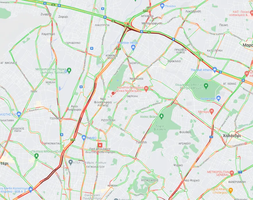 Μποτιλιάρισμα υπάρχει στην άνοδο και την κάθοδο του Κηφισού, στο ύψος των ΚΤΕΛ, στη λεωφόρο Κηφισίας, στη λεωφόρο Αθηνών και στους δρόμους γύρω από το κέντρο της Αθήνας και του Πειραιά.