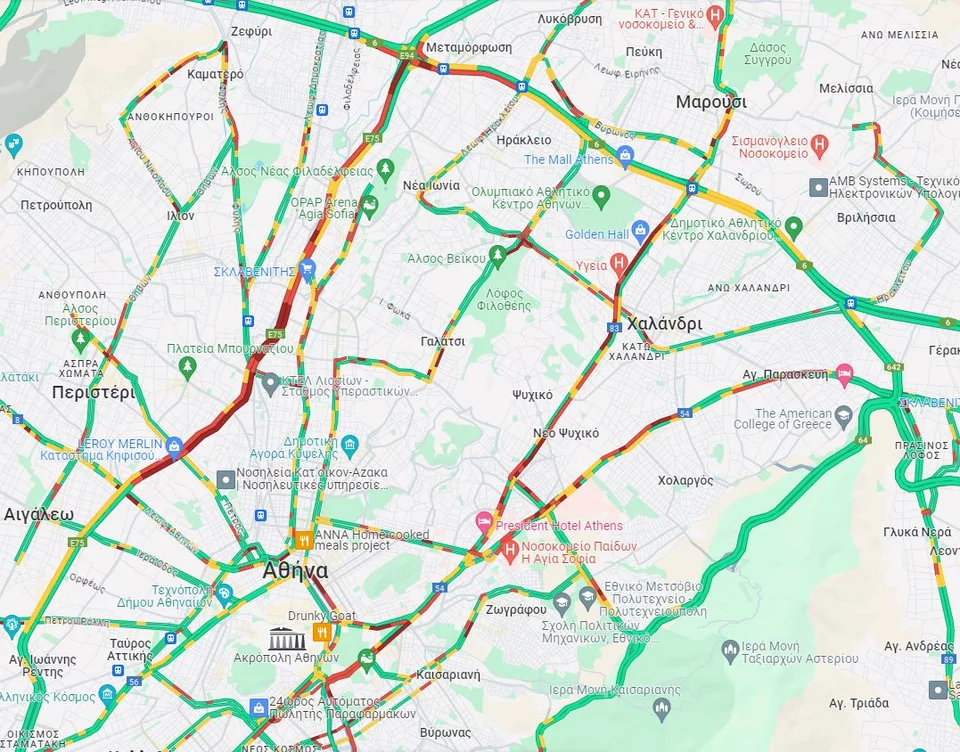 Παράλληλα, σε χαμηλές ταχύτητες κινούνται τα οχήματα στην Λεωφόρο Κηφισίας από την αρχή της μέχρι του Αμπελόκηπους και στα δύο ρεύματα κυκλοφορίας.