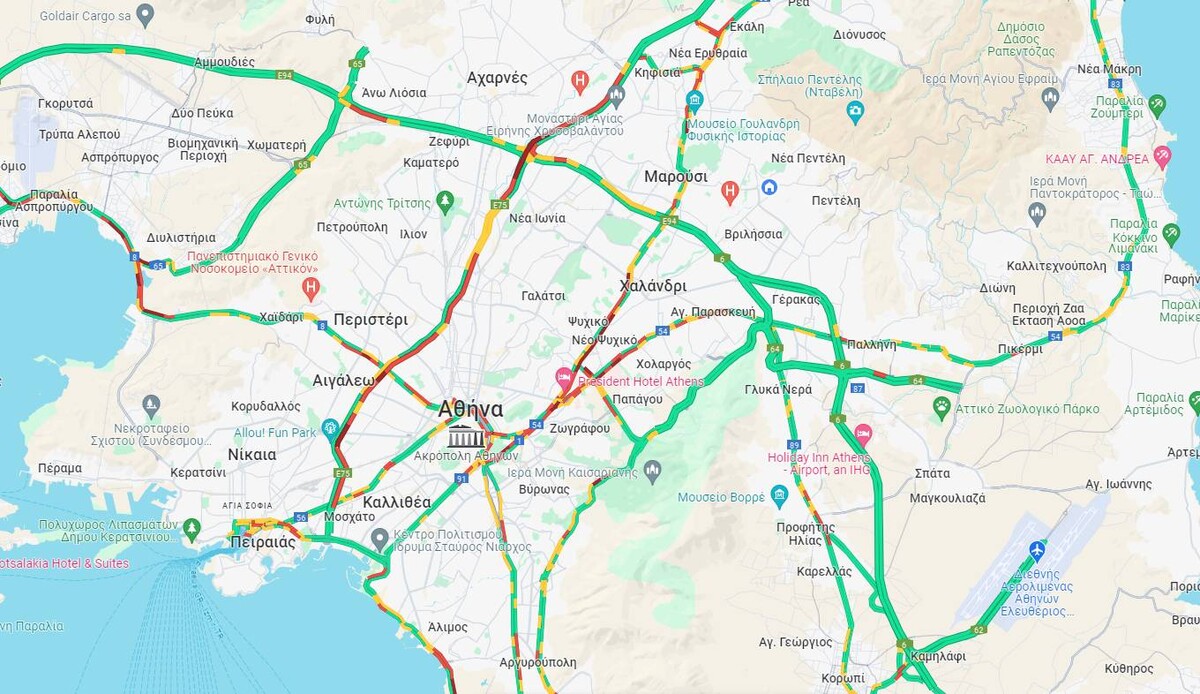 Σημαντικές καθυστερήσεις παρατηρούνται επίσης και στο μεγαλύτερο τμήμα της Κηφισίας, στην αρχή της Μεσογείων, σε τμήμα της Λ.Ποσειδώνος, στους δρόμους γύρω από το λιμάνι του Πειραιά αλλά και στους δρόμους γύρω από το κέντρο της Αθήνας.
