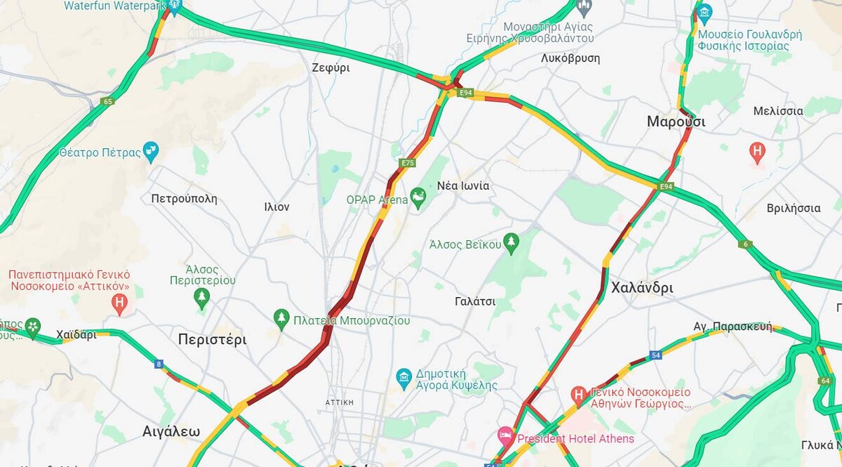 Με χαμηλές ταχύτητες κινούνται τα οχήματα και στα δύο ρεύματα της Λεωφόρου Κηφισού, από το ύψος του Ψυχικού, αλλά και στο κέντρο της Αθήνας οι οδηγοί πρέπει να είναι οπλισμένοι με αρκετή υπομονή.